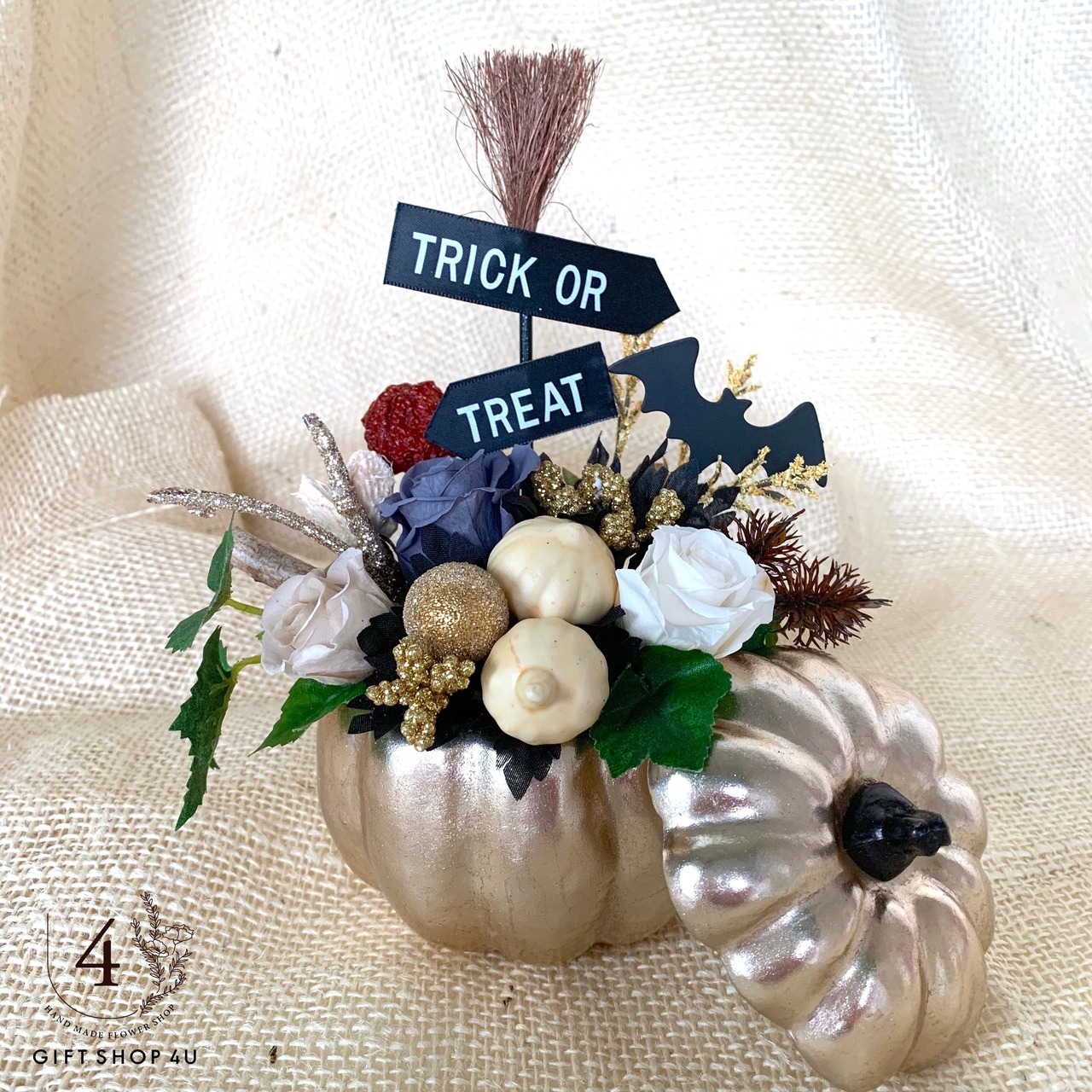 【ハロウィン】ゴールド&ブラック かぼちゃ プリザーブドフラワーアレンジメント ふた付(ゴールド)34