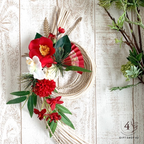 【お正月】お正月お飾り 高さ50cm 迎春正月飾り 椿(ホワイト&レッド)紅白 椿 和柄 しめ縄 リース しめ縄飾り 65